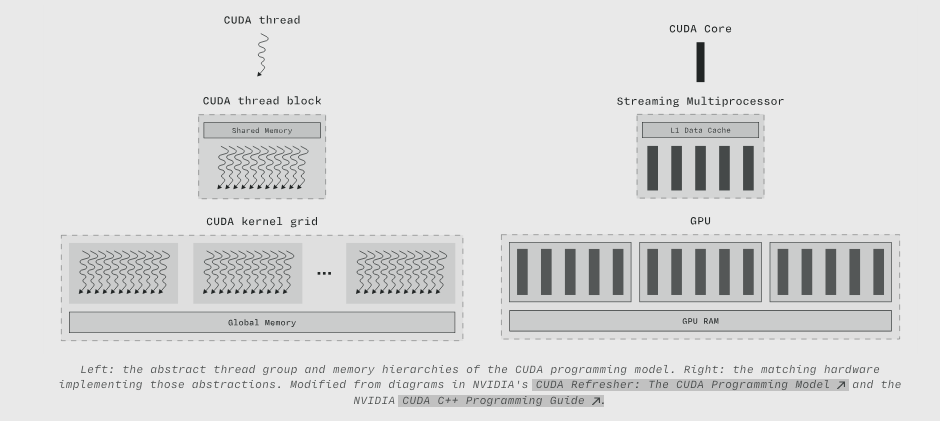 左图:CUDA 编程模型的抽象线程组和存储器层次结构。右图:实现这些抽象概念的匹配硬件。修改自英伟达的 CUDA Refresher: The CUDA Programming Model 和英伟达 CUDA C++ Programming Guide 中的图表。