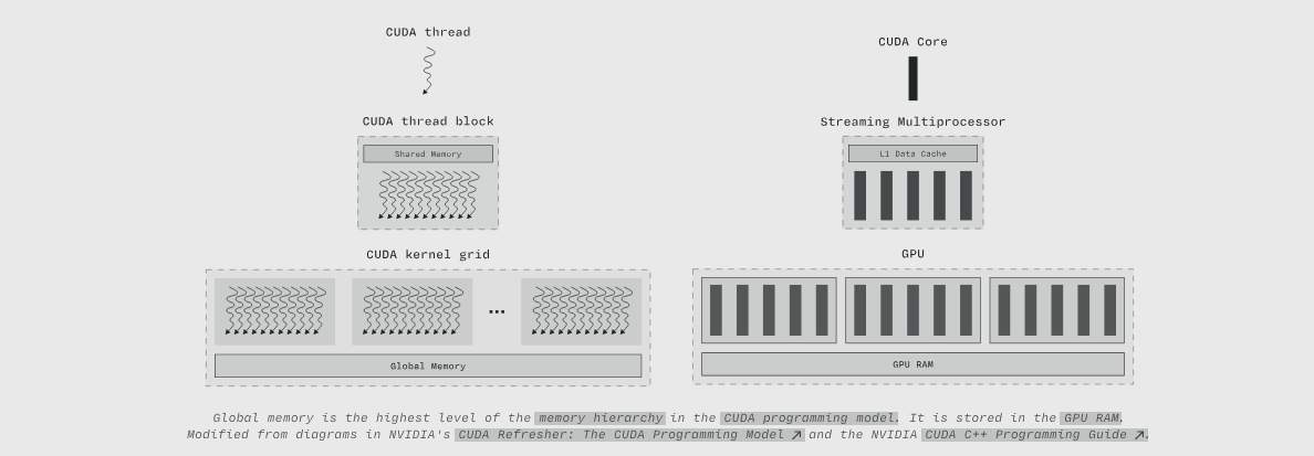 全局内存是 CUDA 编程模型 中内存层次结构的最高层级。它存储在 GPU 显存中。修改自 NVIDIA 的 CUDA Refresher: The CUDA Programming Model 和 NVIDIA CUDA C++ Programming Guide 中的图表。