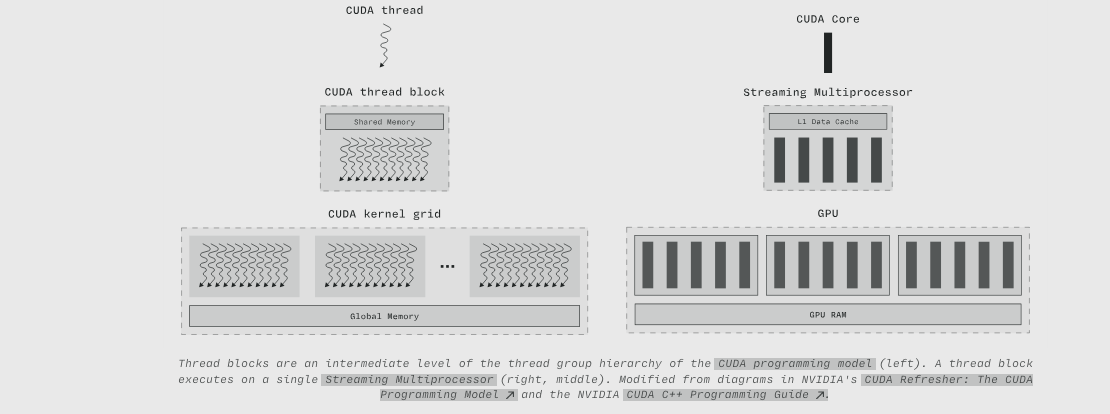 线程块是 CUDA 编程模型 线程层次结构中的中间层级(左图)。一个线程块在单个 流式多处理器 (Streaming Multiprocessor) 上执行(右图,中间)。改编自 NVIDIA 的 CUDA 复习:CUDA 编程模型 和 NVIDIA CUDA C++ 编程指南 中的图表。