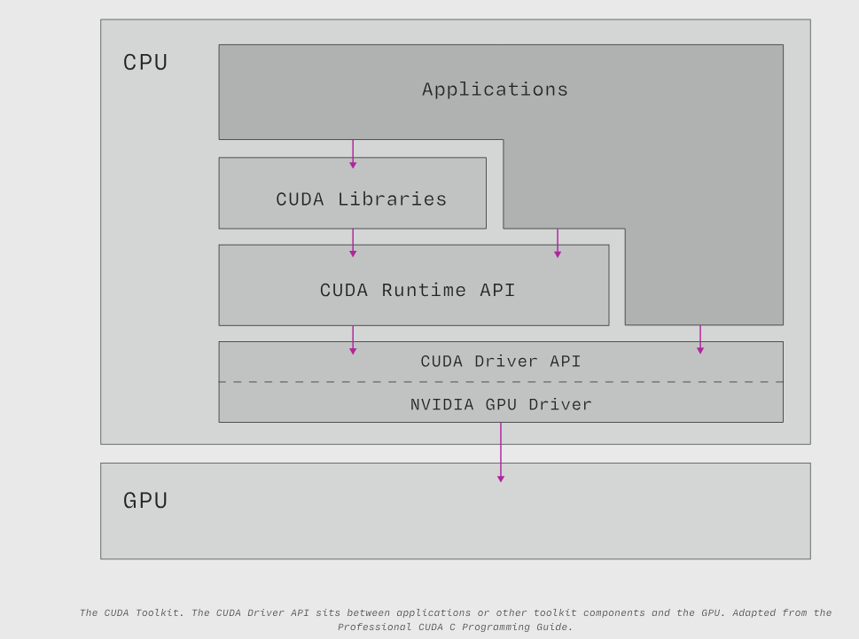 CUDA 工具包。CUDA 驱动 API 位于应用程序或其他工具包组件与 GPU 之间。改编自《Professional CUDA C Programming Guide》。