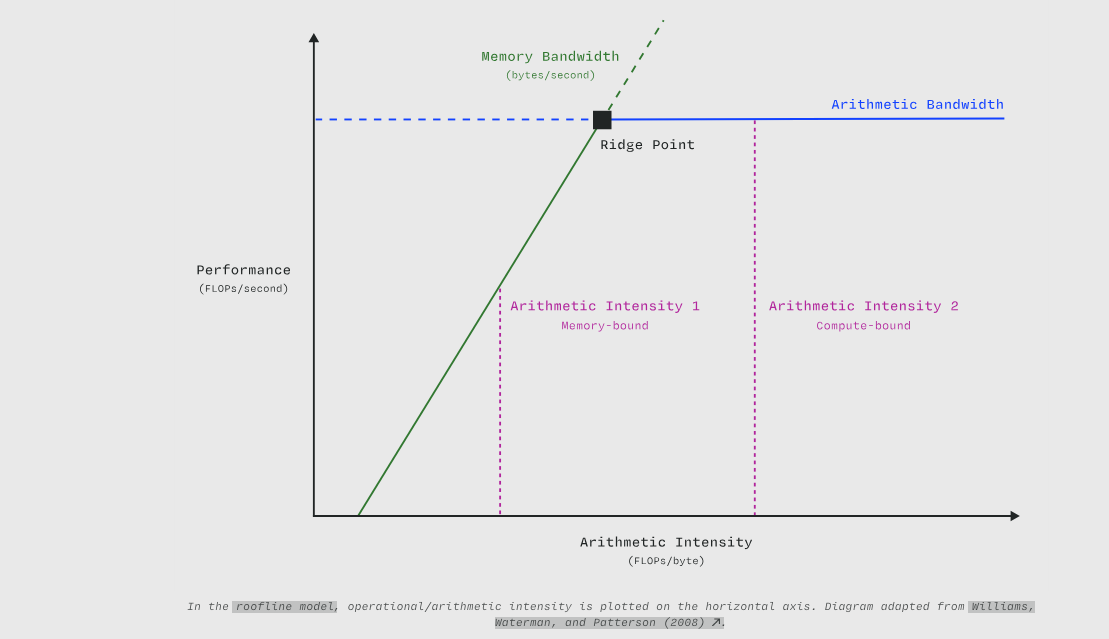 | 系统 (计算 / 内存) (System (Compute / Memory)) | 算术带宽 (Arithmetic Bandwidth) (TFLOPs/s) | 内存带宽 (Memory Bandwidth) (TB/s) | 脊点 (Ridge Point) (FLOPs/byte) |
